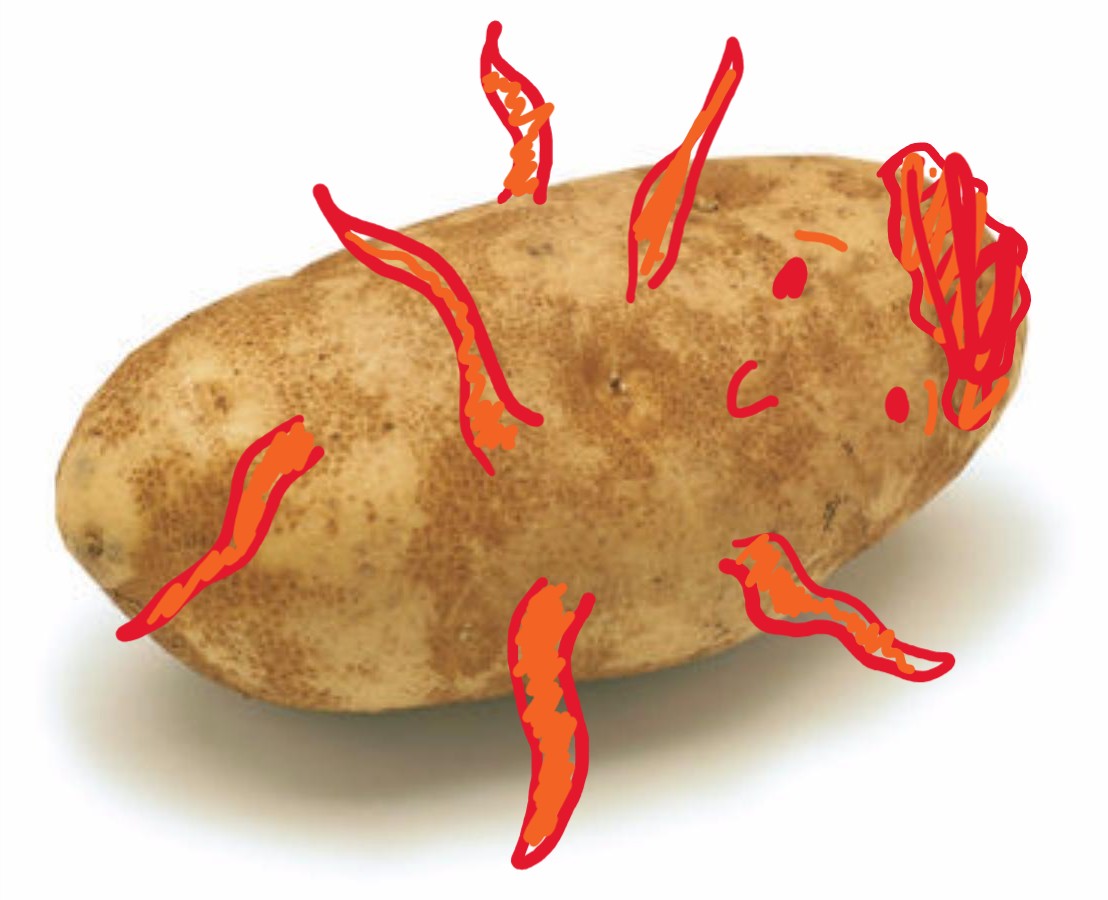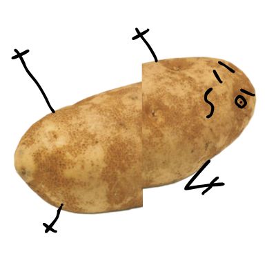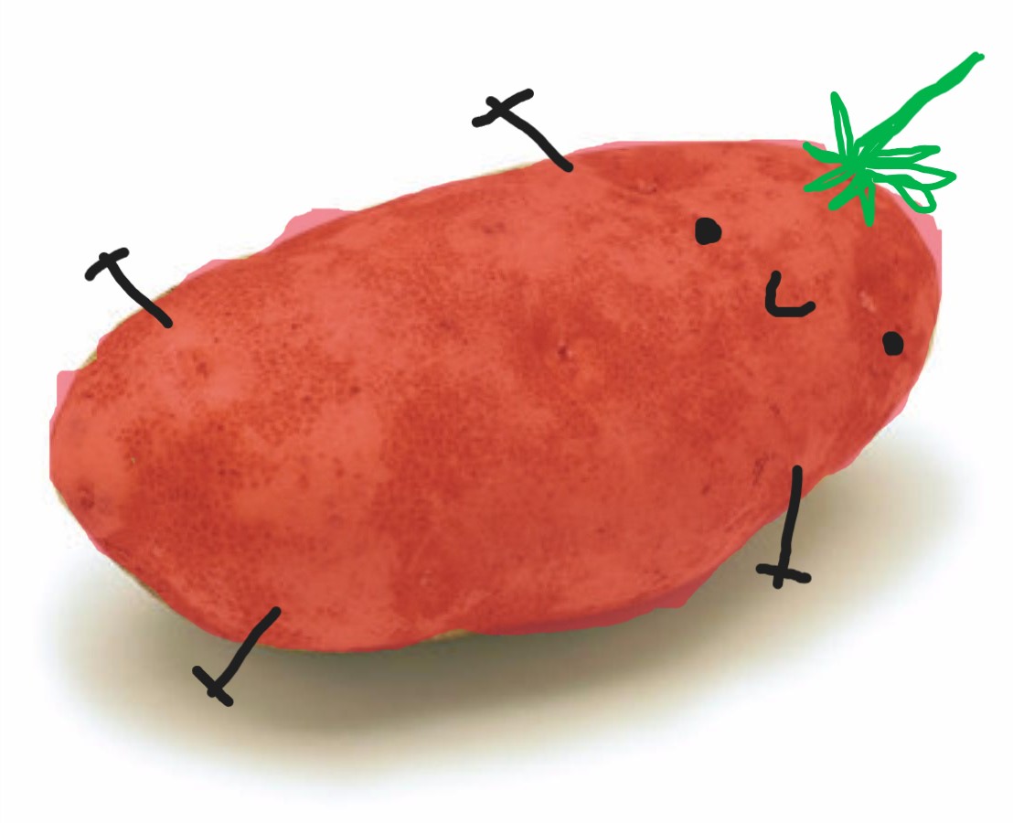 One of the most interesting potatoes, potatomatos is a potato-tomato hybrid, yet another one of the hybrids made by the Very Secret Company. Initially used for reconnaissance work for the tomato-potato war, this potato has since become a symbol of peace, a relic of war preserved years after the treaty of Pomatus was formed. Today, however, the original hybrid made by the Very Secret Company has long since decomposed, and the treaty has made it so that no more have been made, so homo sapiens is attempting to recreate it by cutting tomatoes and potatoes in half, and using the almighty power of duct tape to stick them back together. Do not despair, this transmogrification process only uses volunteer vegetables/fruits, and the patients are sedated during the procedure.